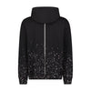 Black cotton french terry deconstructed oversized drop shoulder hoodie with black glitched "Haculla" 3D embroidered across the chest with a Dusty Pink hand painted paint swipe across and artisanal hand-painted finish