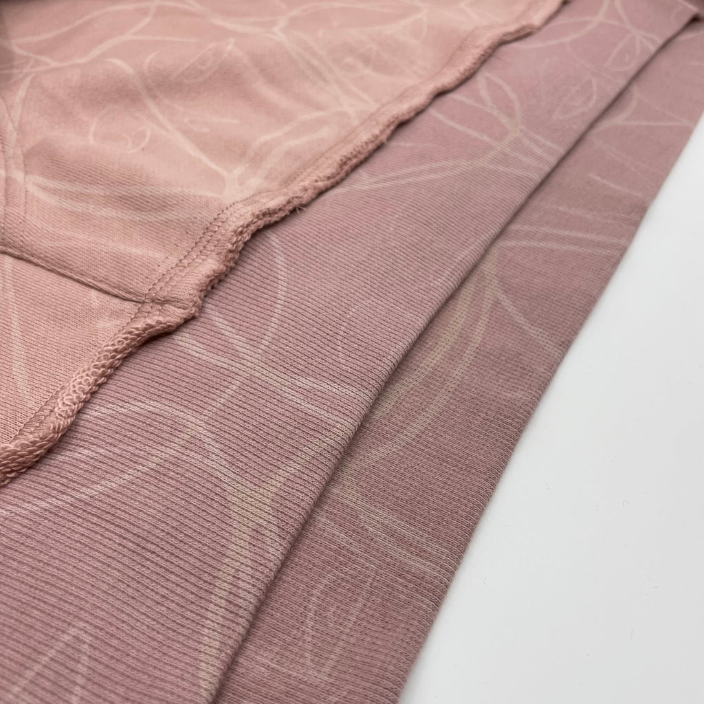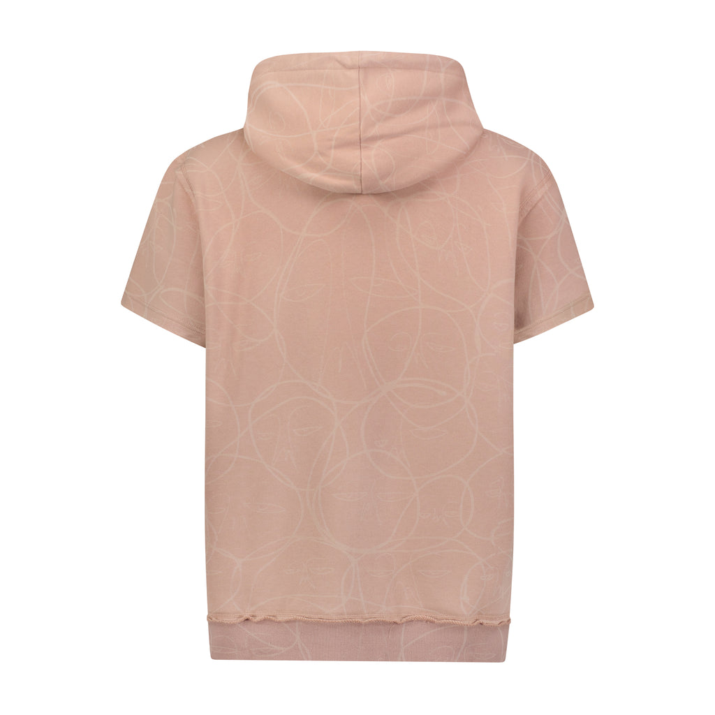 Dusty Pink cotton french terry deconstructed oversized drop shoulder short sleeve hoodie with the laser burned One of a Kind allover print