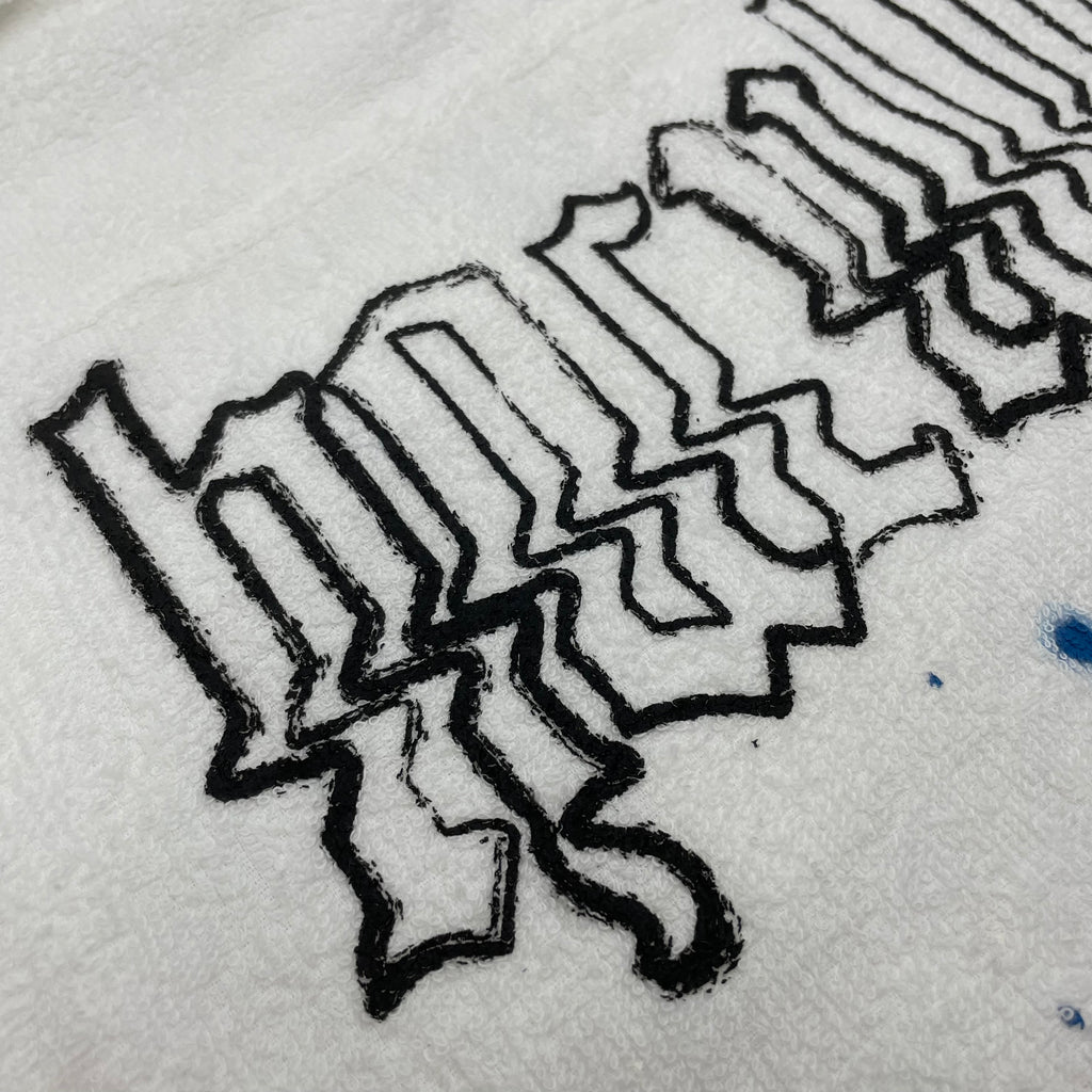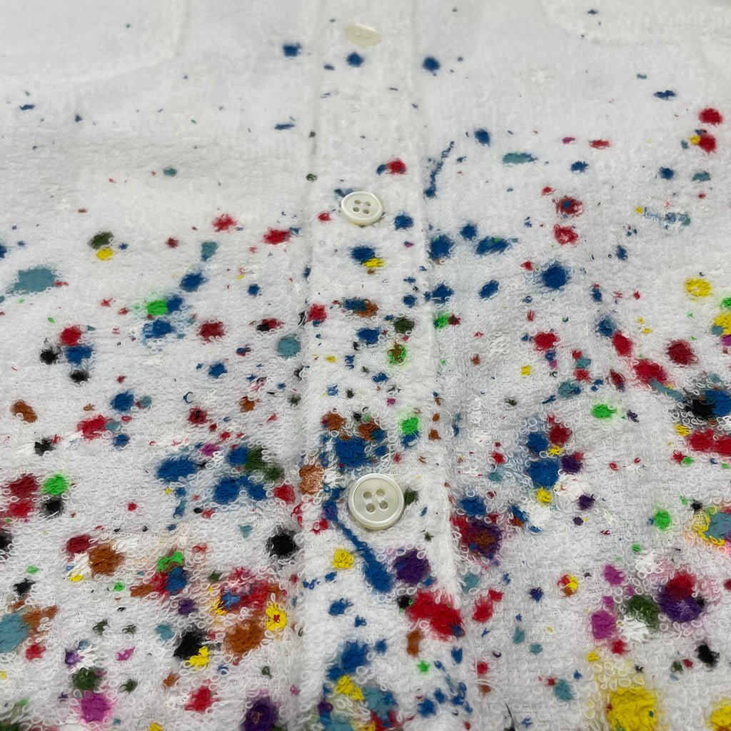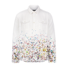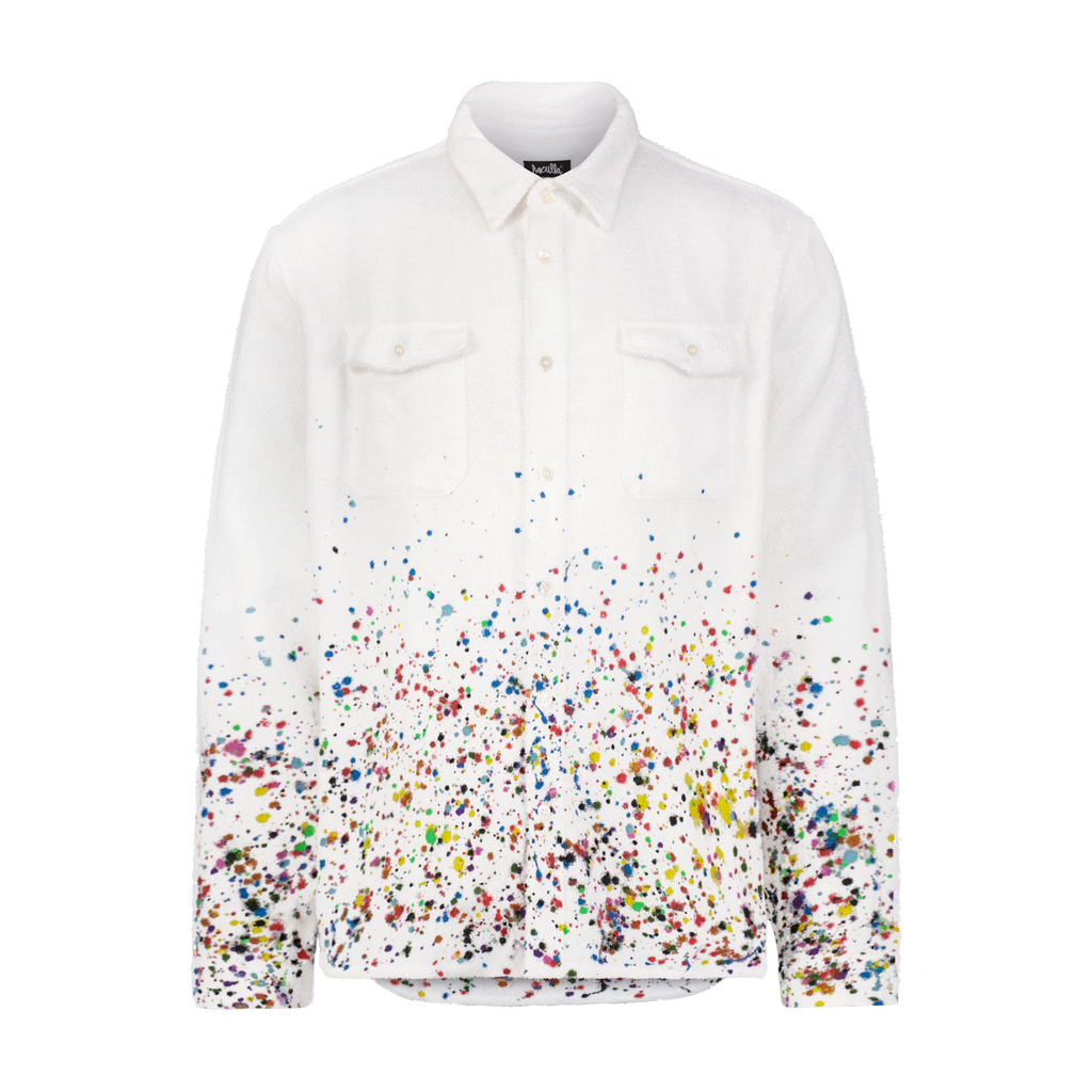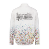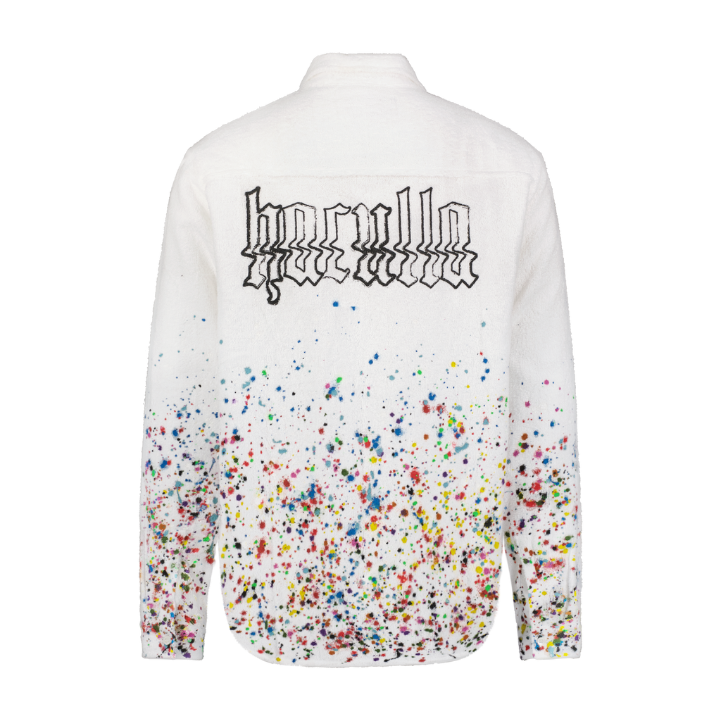 Off-White cotton textured standard shoulder, long-sleeved button down shirt with hand-painted glitched Haculla and artisanal hand-painted finish