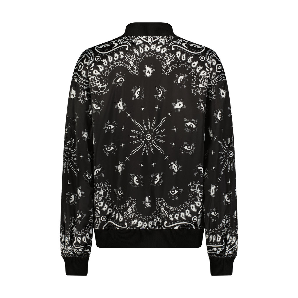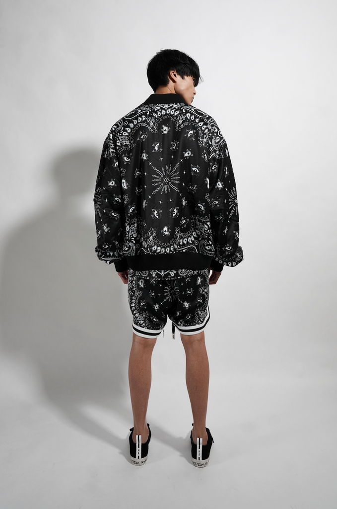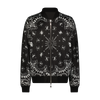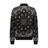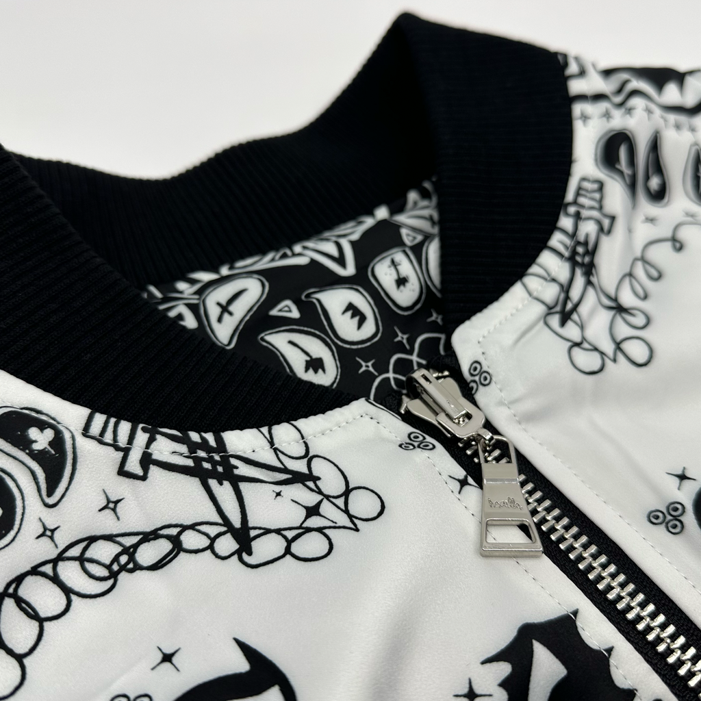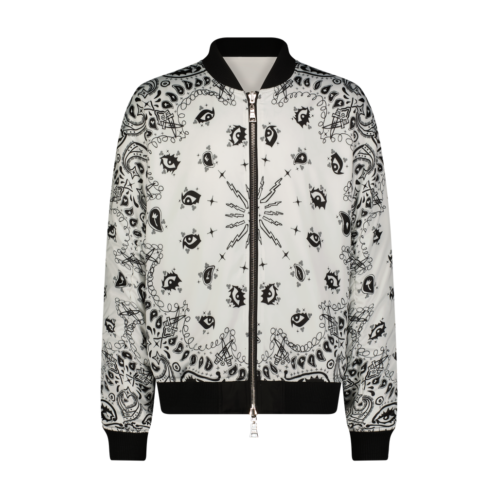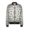 Black and white reversible viscose, oversized, drop shoulder custom Haculla paisley bomber with zip MA-1 patch pocket, branded zipper puller, and front zip fastening