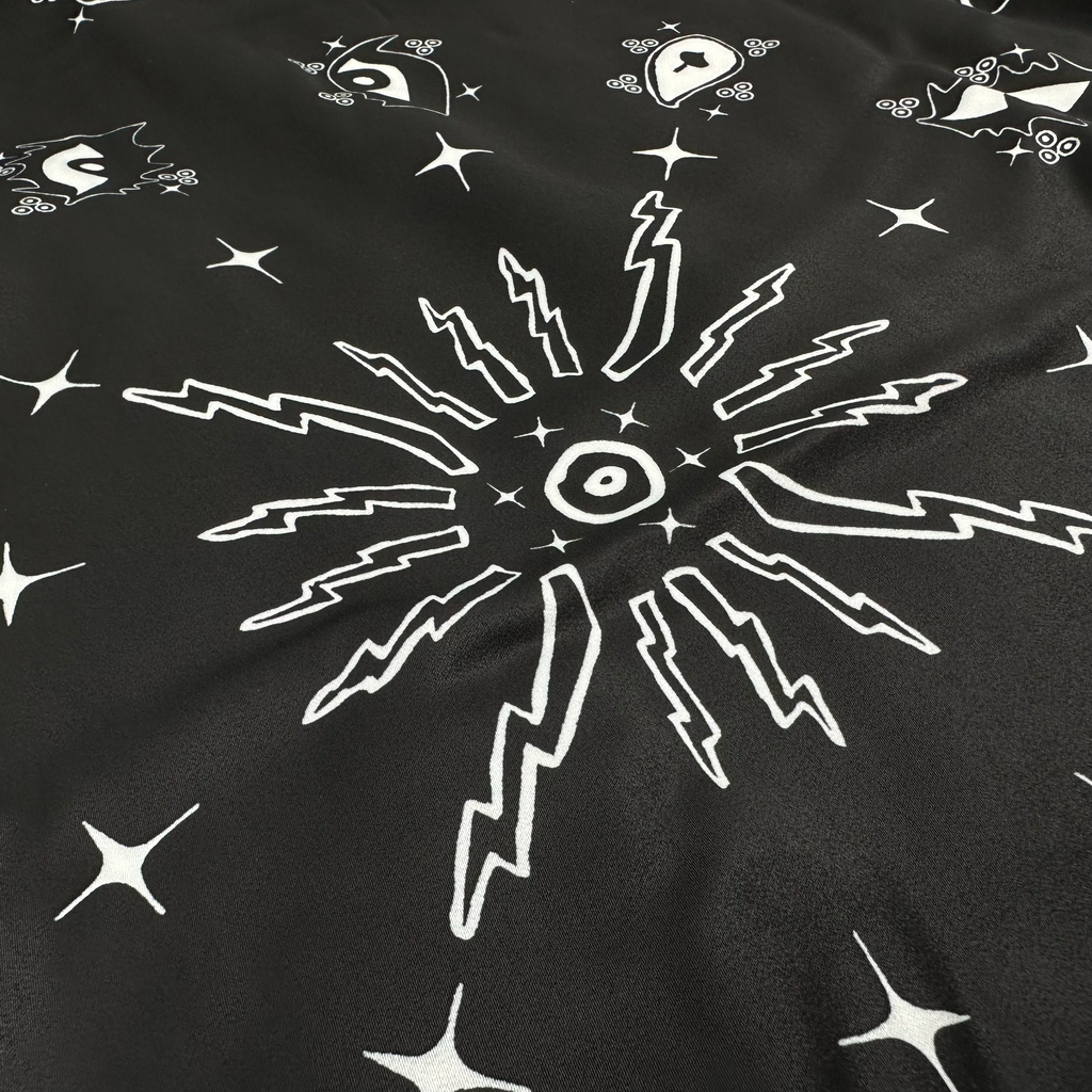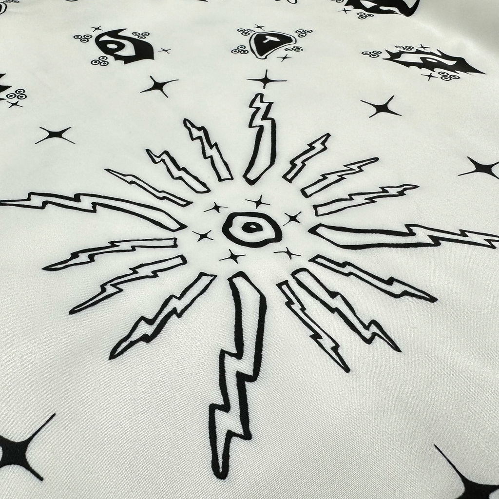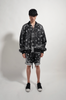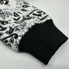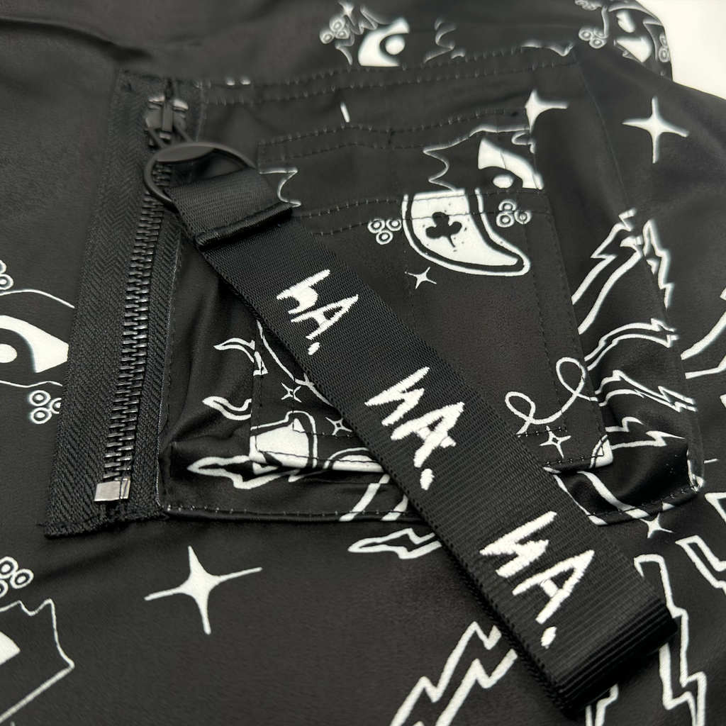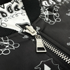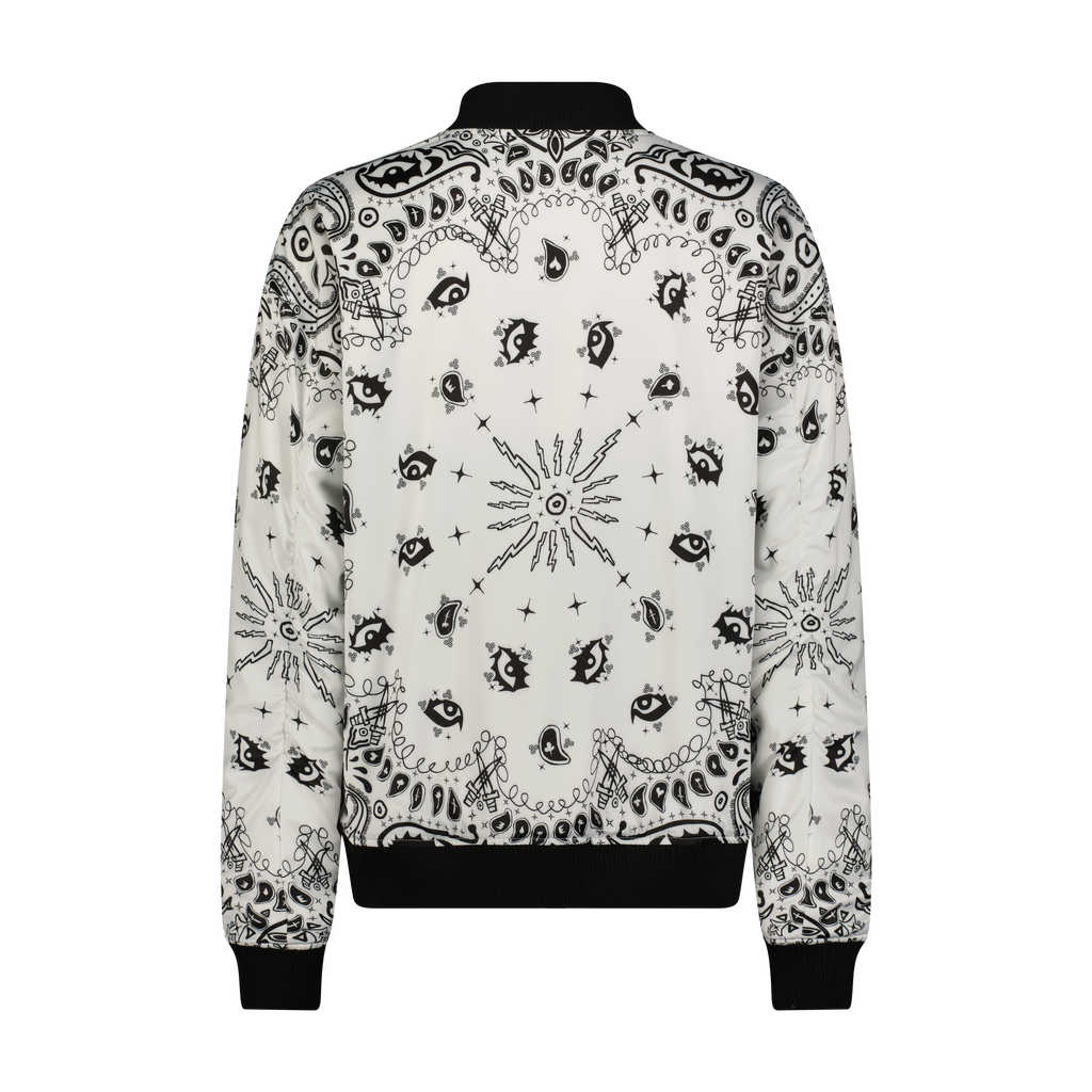 Black and white reversible viscose, oversized, drop shoulder custom Haculla paisley bomber with zip MA-1 patch pocket, branded zipper puller, and front zip fastening