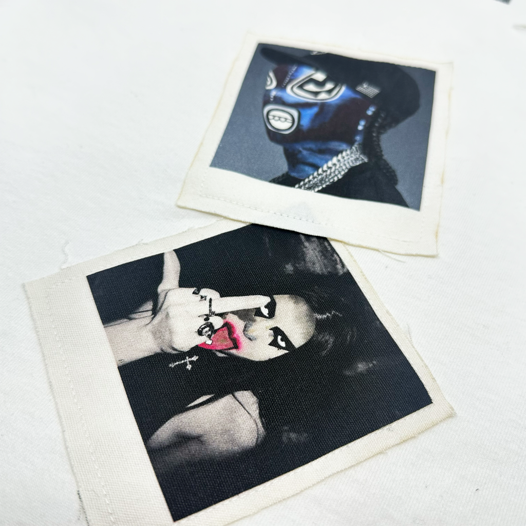* 9 polaroid patches made out of off-white canvas with Haculla monster images printed onto them
