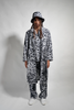 Off-white cotton terry, oversized, drop shoulder overcoat with flap pockets, 2 horn button closures, tie belt, and repeat print of a new rendition of our classic One Of A Kind