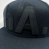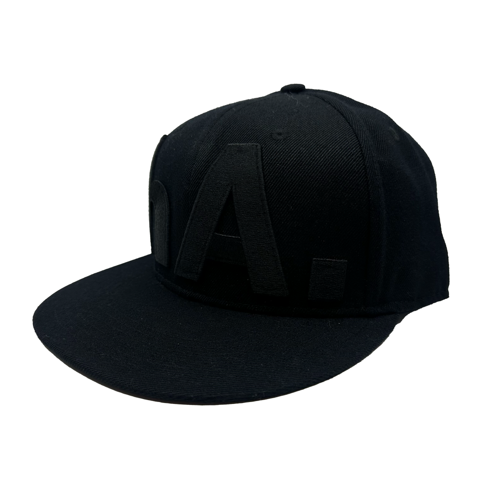Black cotton twill flat brim snapback hat with iconic tonal "hA." 3D embroidered on the front of hat