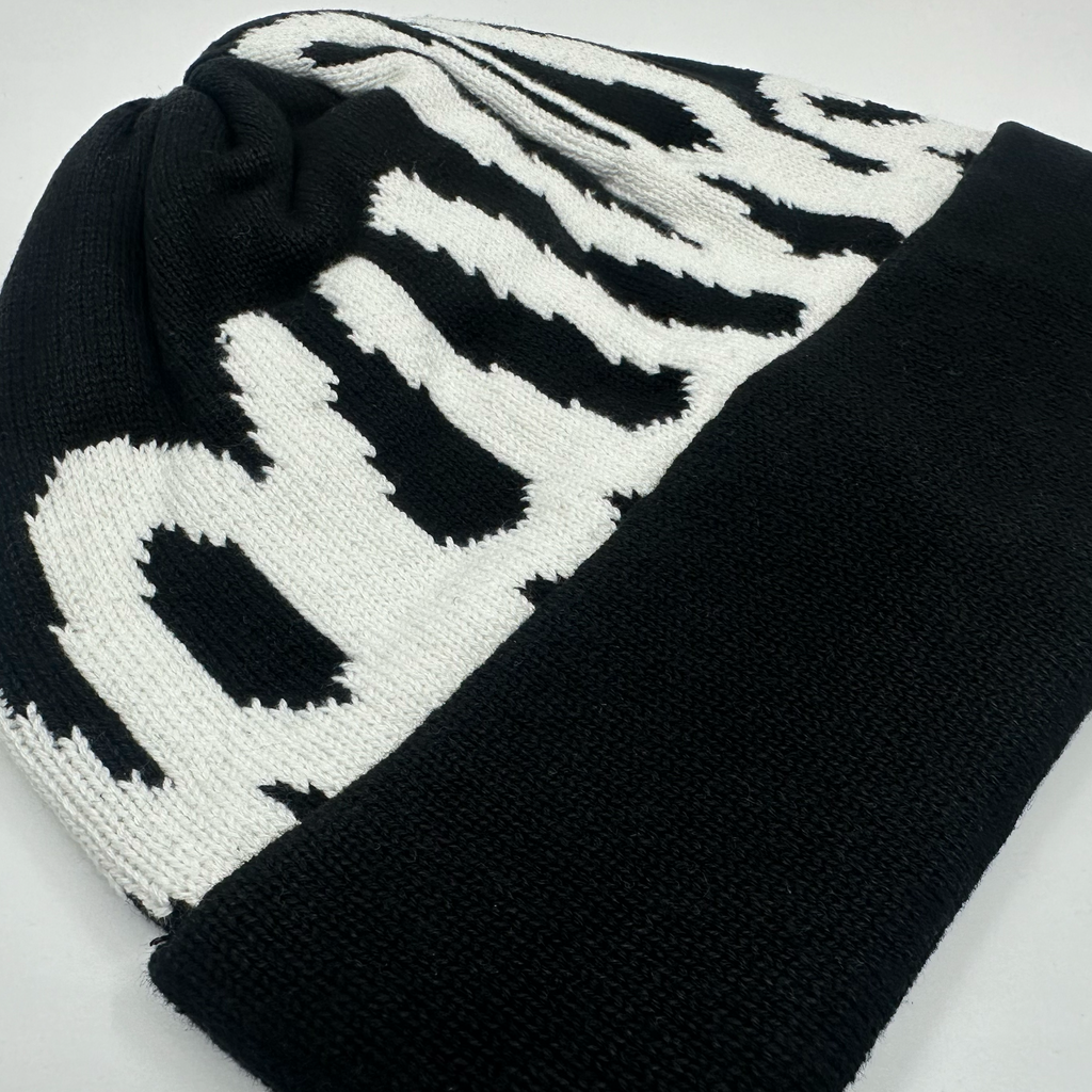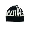 Black wool blend beanie with "haculla" logo knitted into the body of the beanie