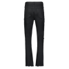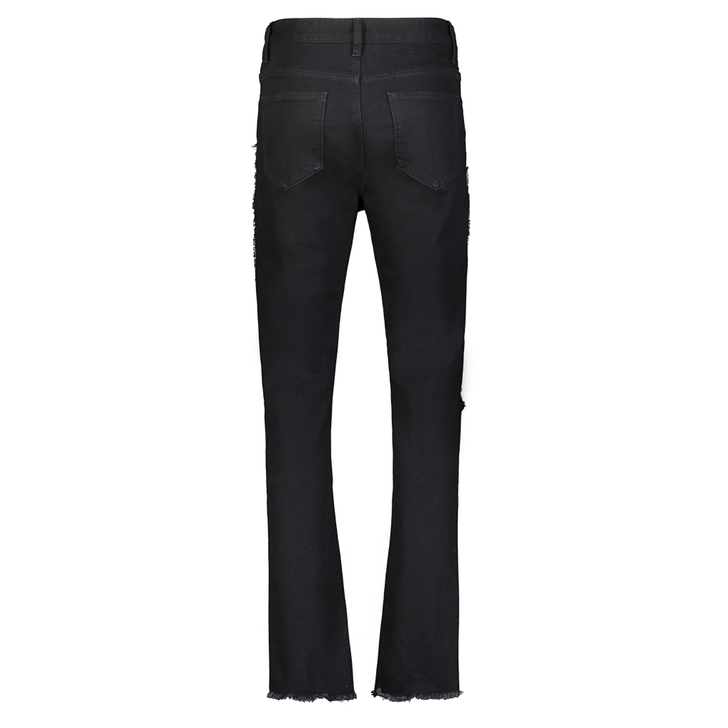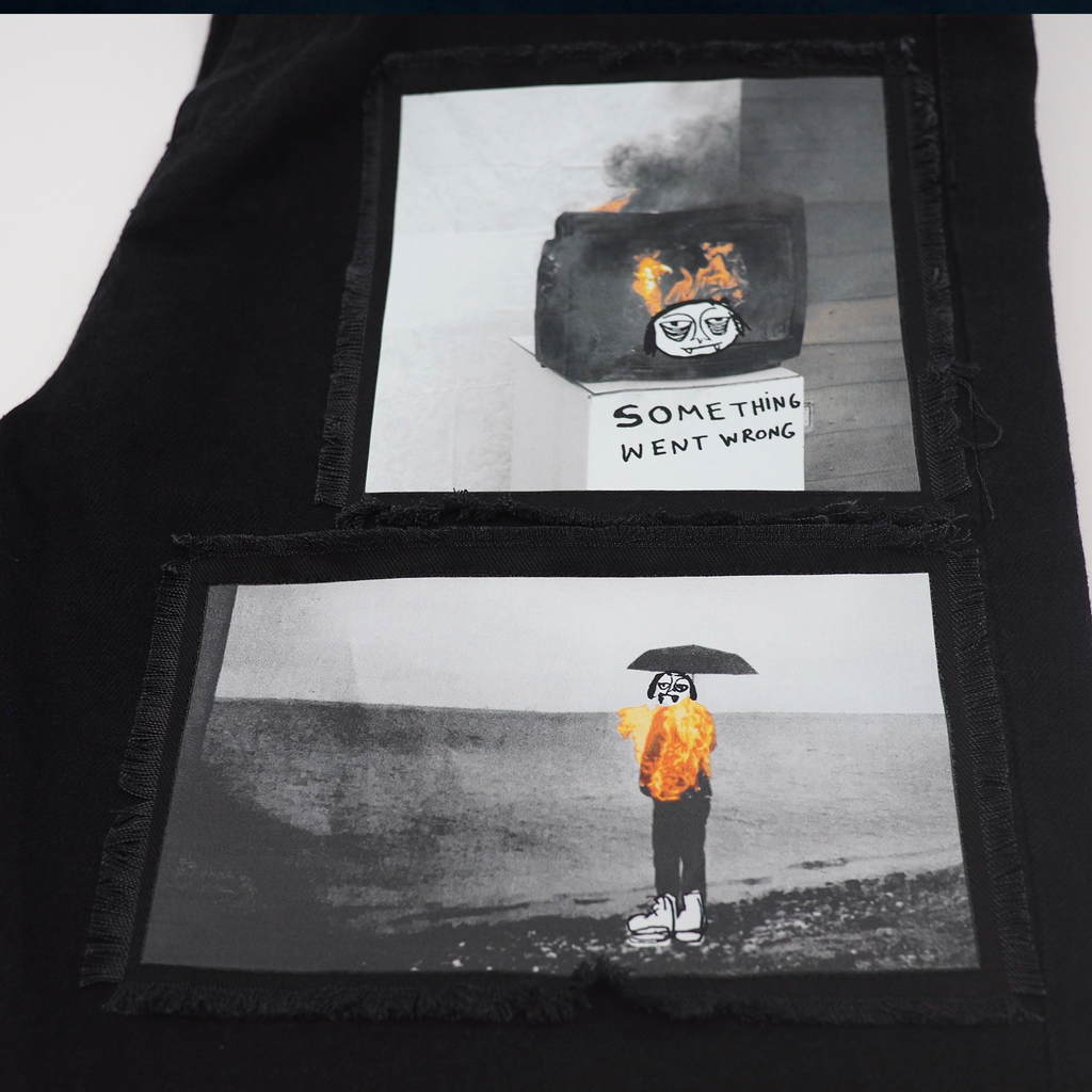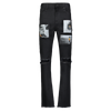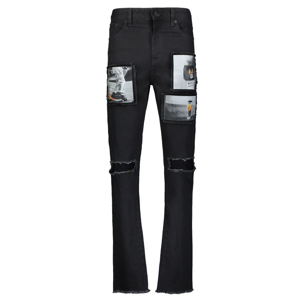 Jet black stretch denim slim fit jeans with raw edge appliqué photo transfers with phrases directly embroidered on top.