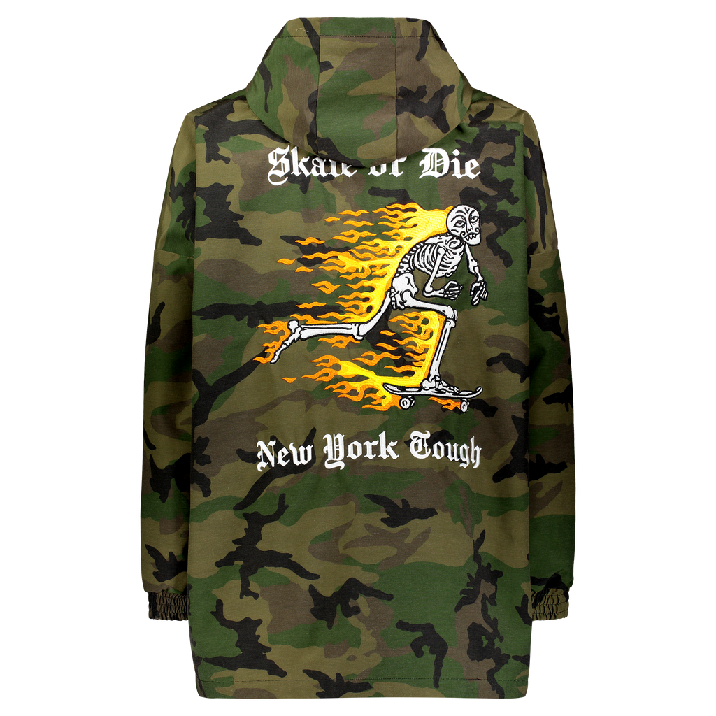 Poly cotton camo Eyes on Fire embroidered long sleeved jacket with front zip fastening