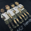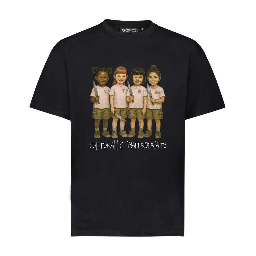 Black aged cotton jersey short sleeve tshirt, new standard baggy, drop shoulder tee with graphic of 4 young girls holding weapons on the chest and "CULTURALLY INAPPROPRIATE" below it, and MHRS tyvek label at the back neck.