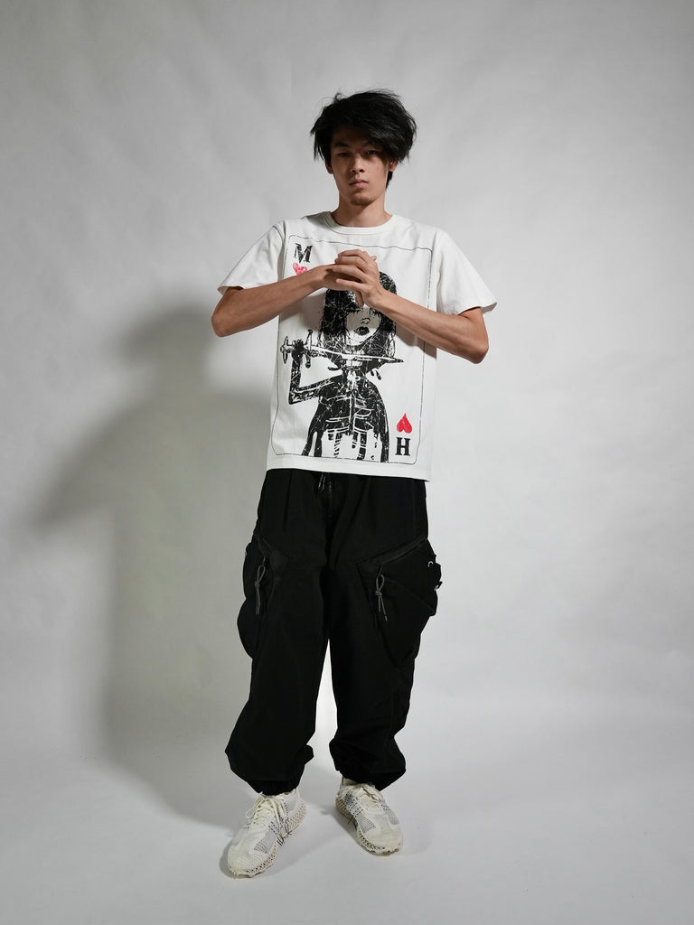Off-white aged cotton jersey oversized, drop shoulder, short sleeve tshirt with large custom heart playing card graphic on the chest, heartfelt quote on the back hem and MHRS tyvek label at the back neck.