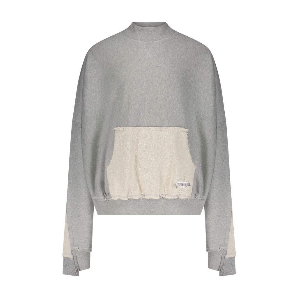 Heather grey cotton french terry and reverse side of black cotton french terry exaggerated oversized crewneck with mock neck and front kangaroo pocket