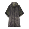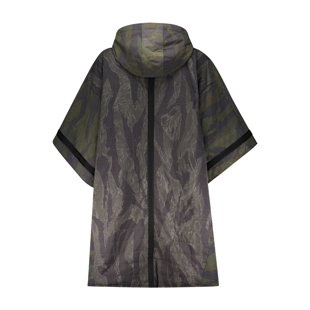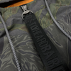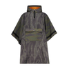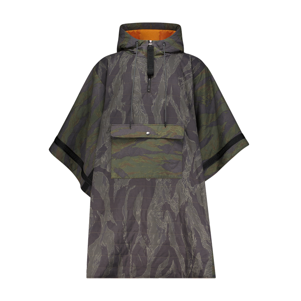 Mixed camo pattern blocking shell with multi-pattern quilting with iridescent nylon orange lining, a draw string hood with one way zipper and one front snap patch pocket