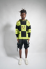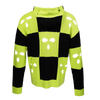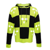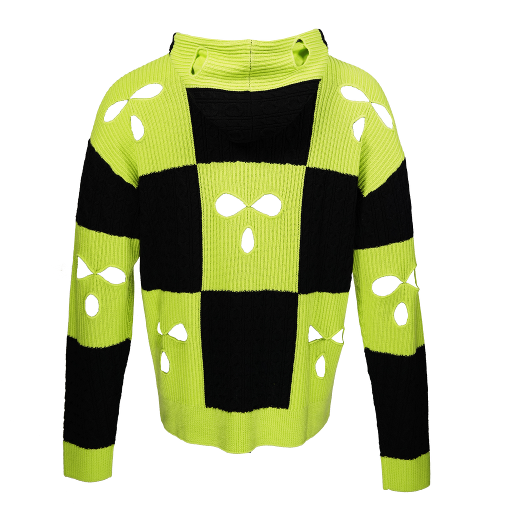 Black and neon lime checkered wool oversized, drop shoulder hoodie with mixed sweater knits and ski mask holes throughout and branded season receipt at back neck