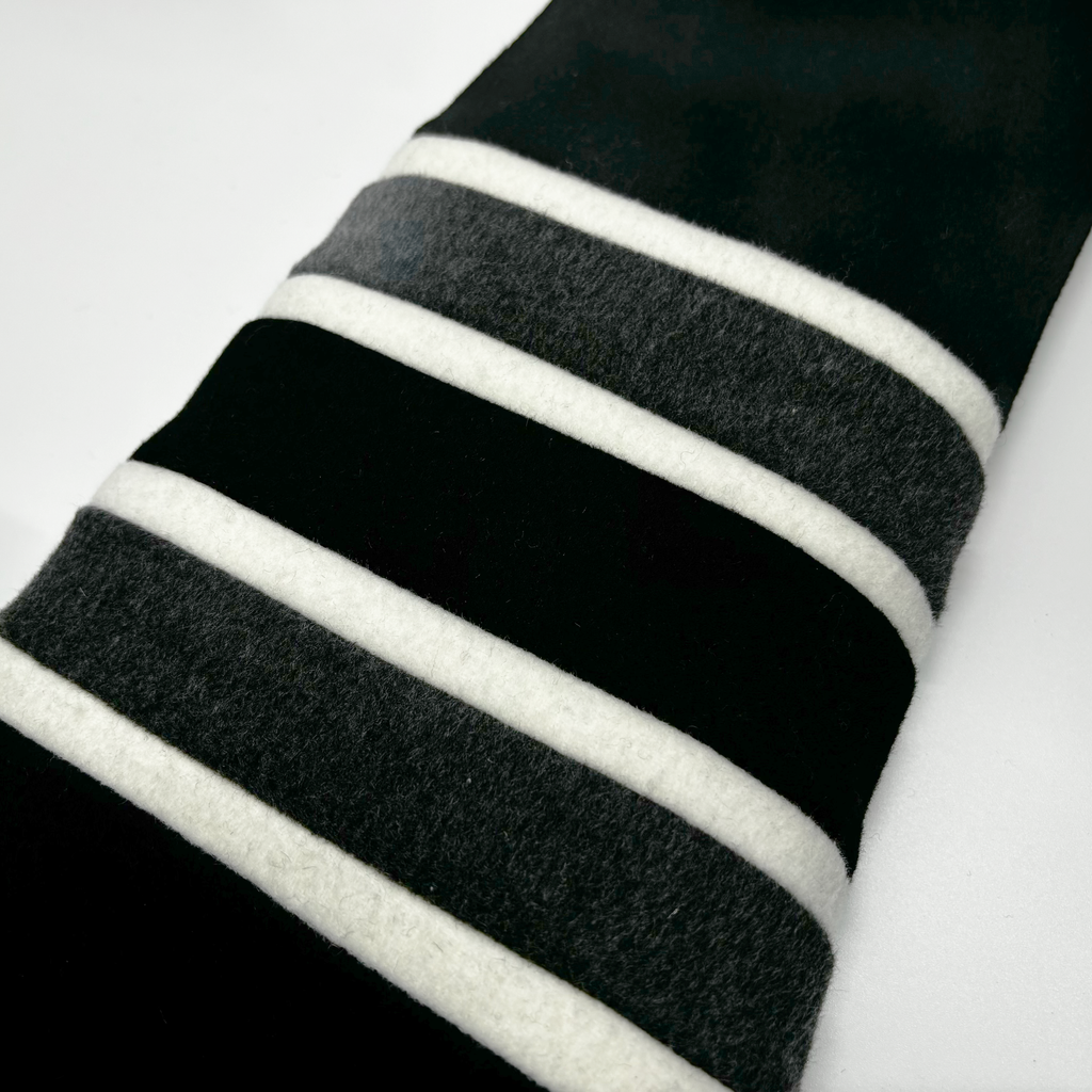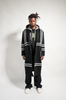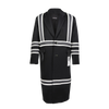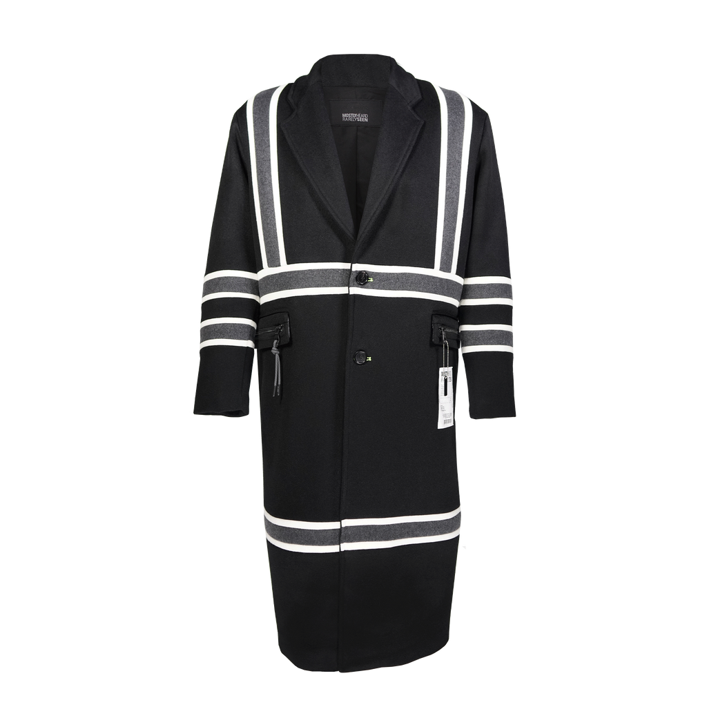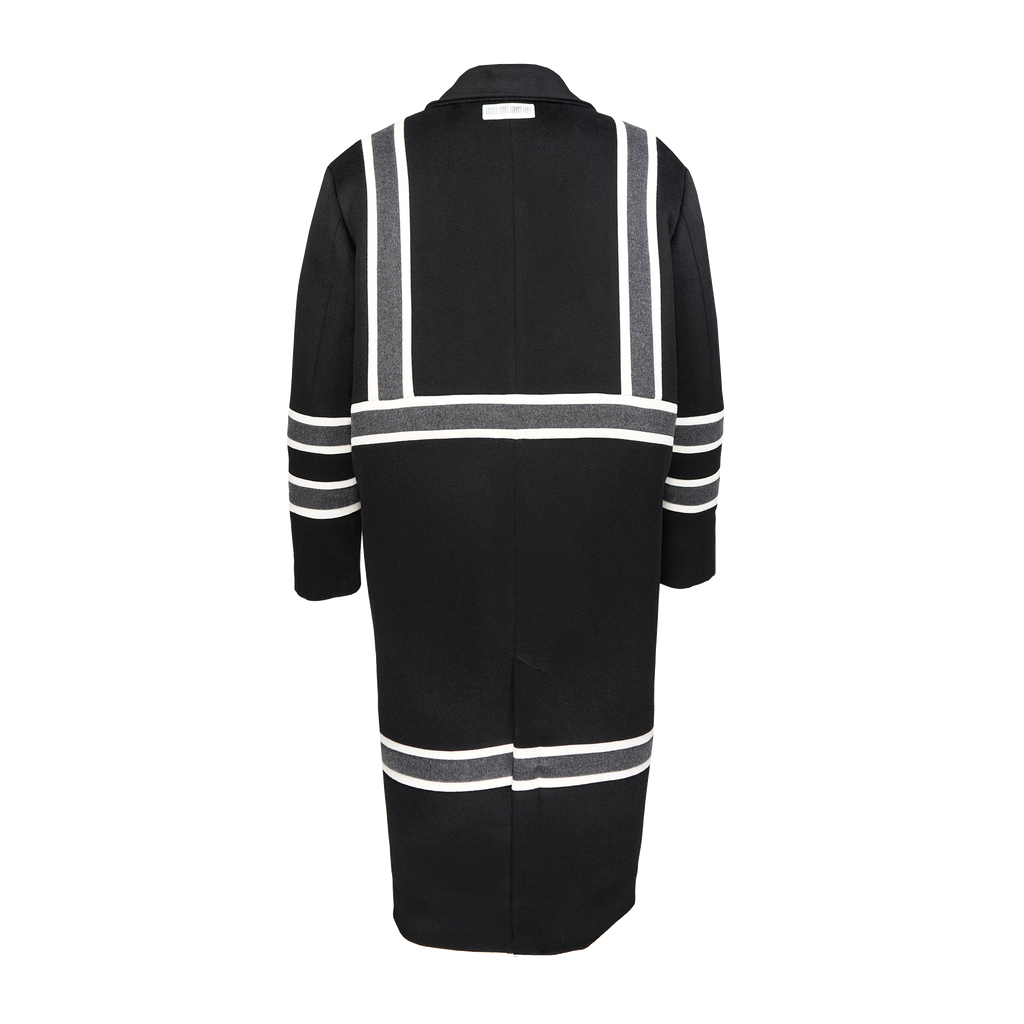Black wool overcoat with cut and sew wool workwear seams, neon lime contrast button hole sitiching, branded alternating zipper pullers and branded season receipt on front below pocket