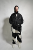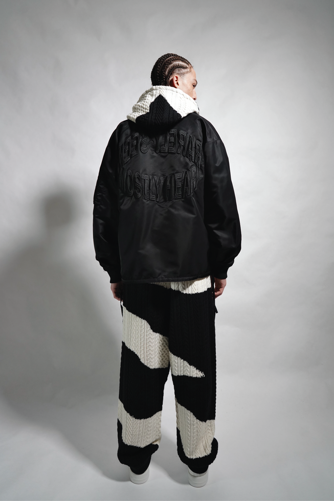 Black and cream custom camo cable knit wool wide leg, pleated jogger with 3 branded drawcords tunneled through the waistband.