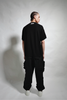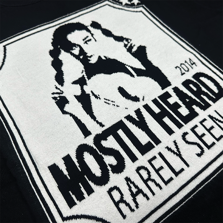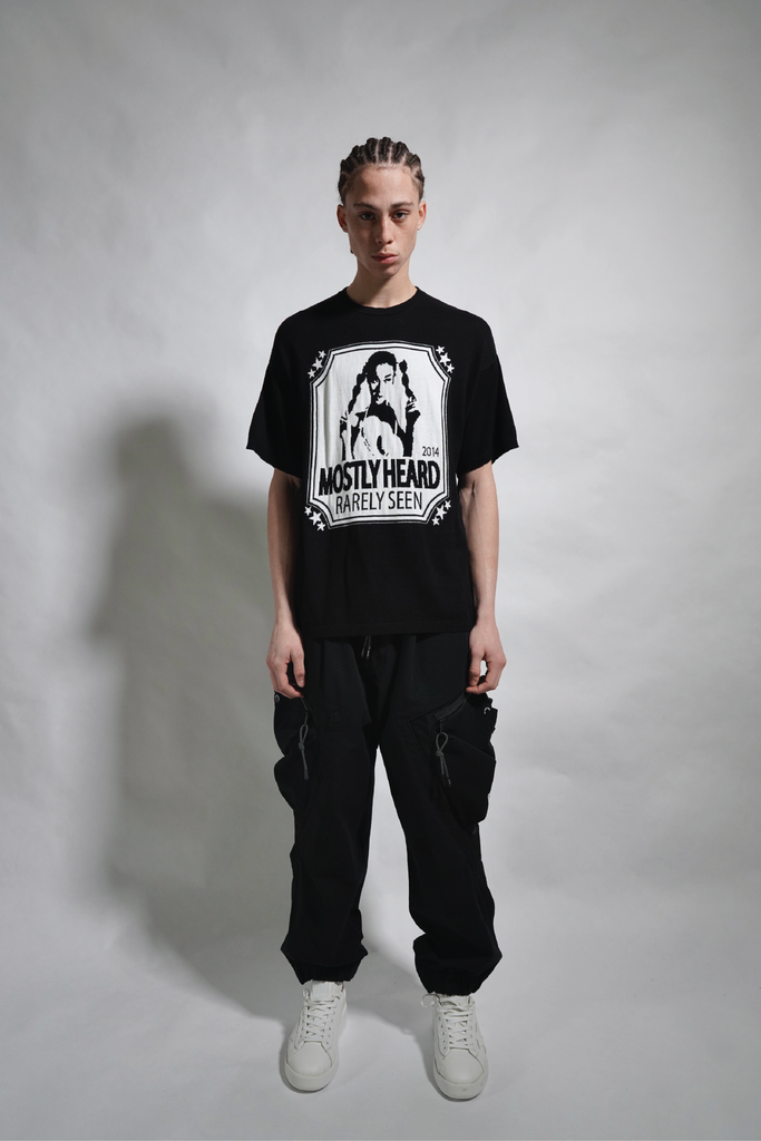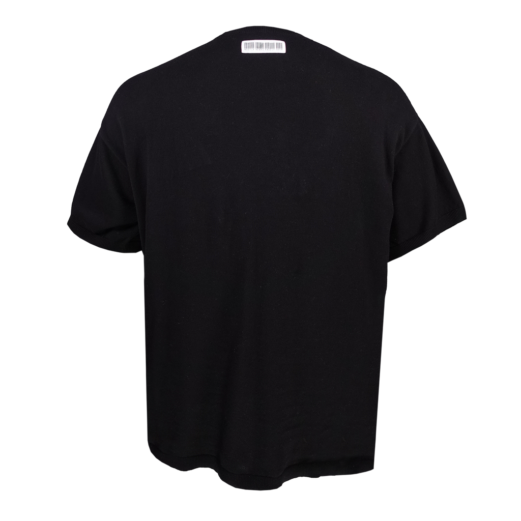 Black oversized, drop shoulder t-shirt sweater with custom GoGo girl graphic intarsia on the chest.