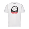 Off-white cotton box tee with custom graphic print of a girls face cut in three on the chest and branded season receipt at back wearers right hem with ripped detailing.