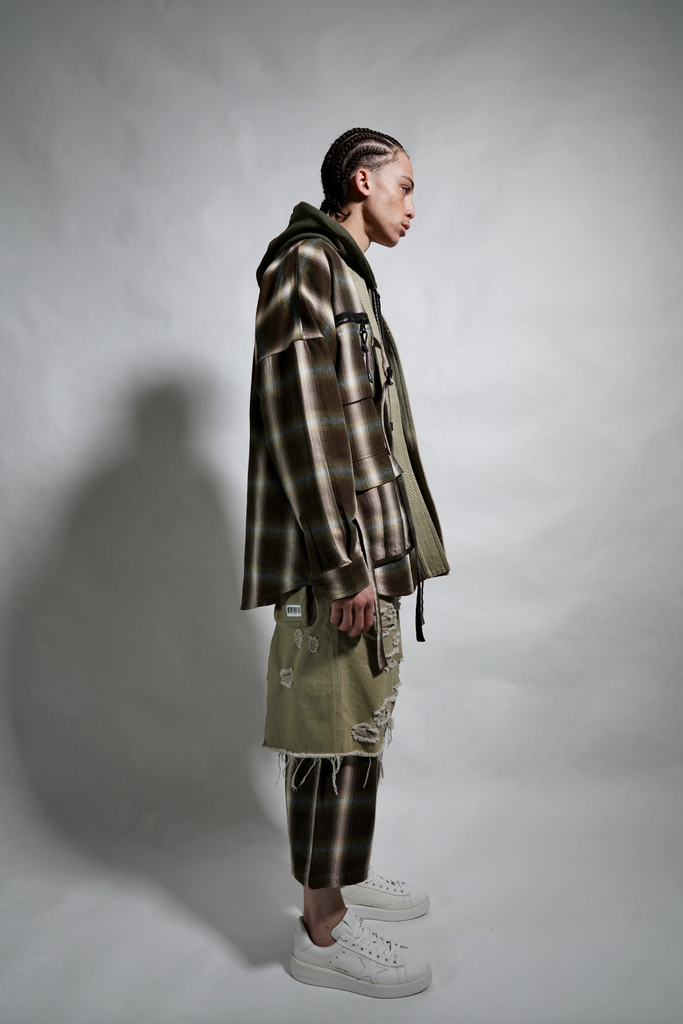 Khaki denim oversized, drop crotch short with exaggerated cargo pockets on back and custom branded button fastenings layered on top of brown plaid drop crotch trousers.