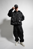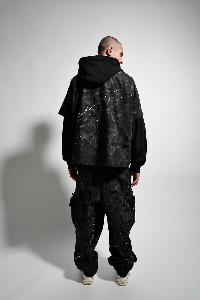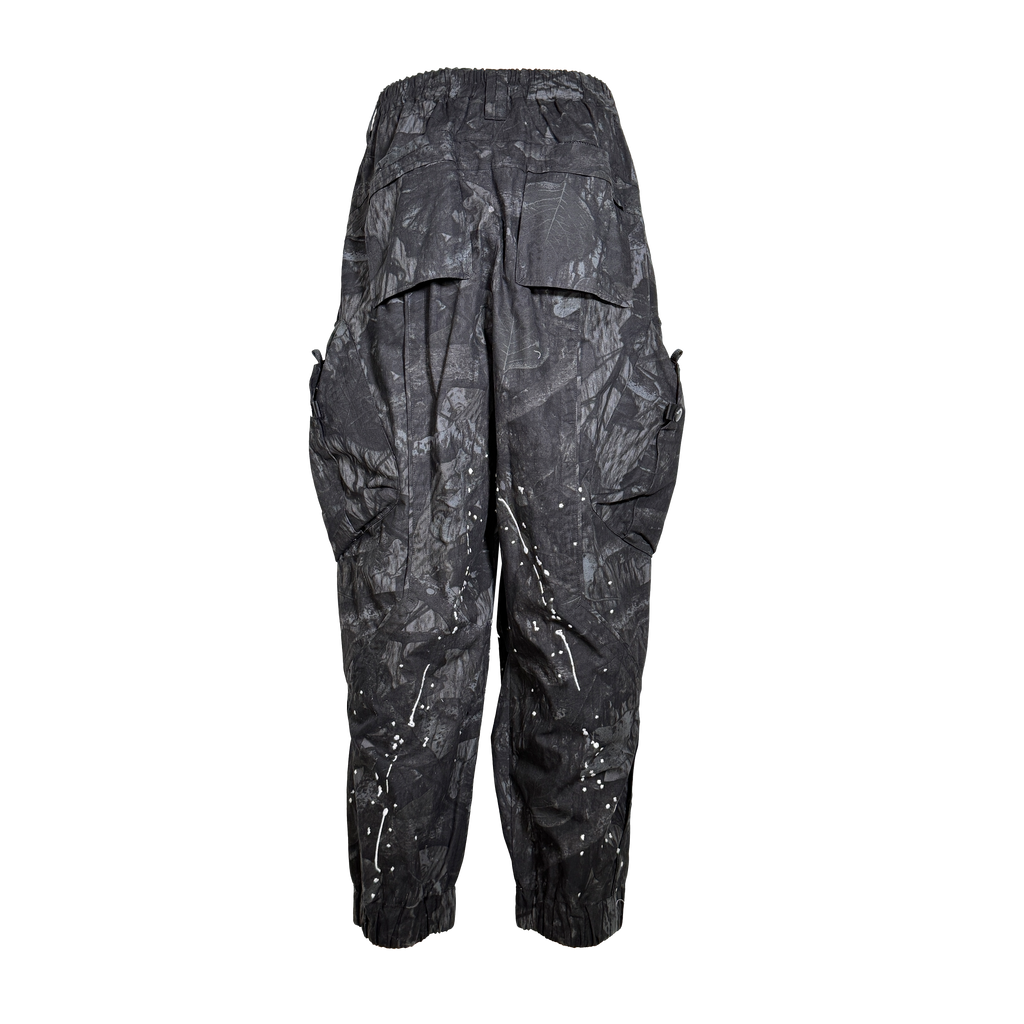 Extremely oversized jogger pants made in photoprint camouflage with zig zag cut seams inset with large 3D inset pockets, exaggerated cargo pockets on back and custom branded zipper pullers, MHRS signature tyvek barcode and embroidered paint detailing