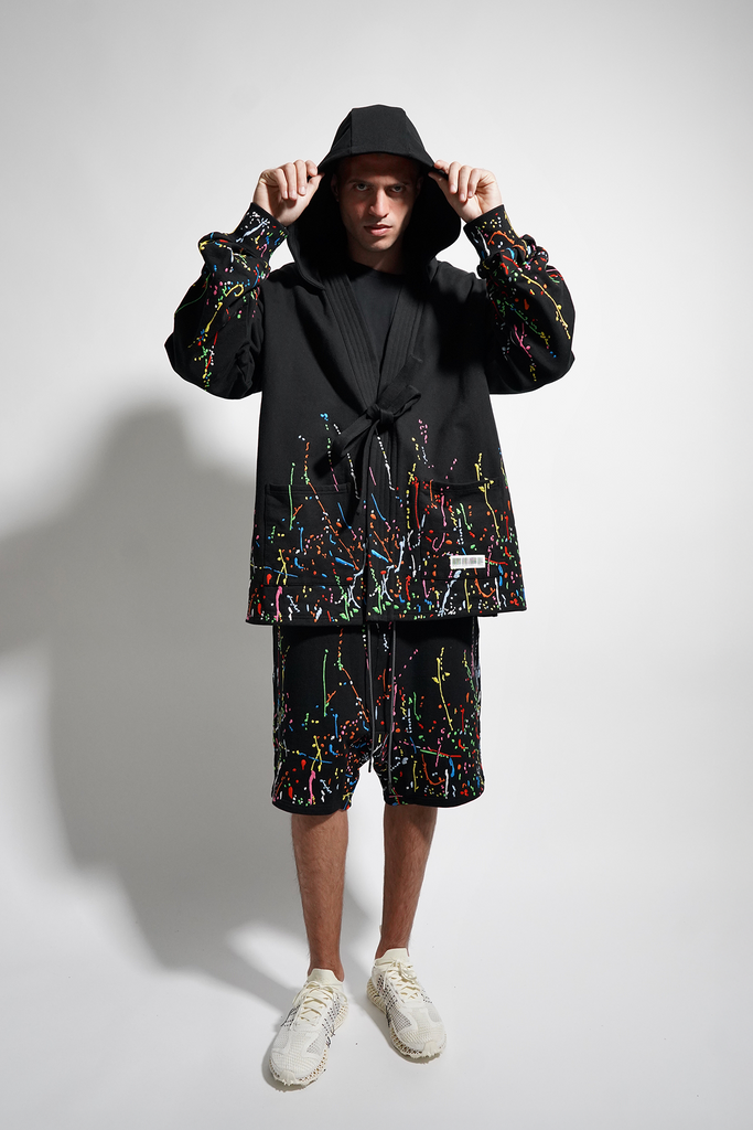 Kimono X cotton french terry oversized, drop shoulder, pleated balloon sleeve hoodie hybrid outerwear piece with tie front closure, patch pockets, MHRS signature tyvek barcode, and embroidered paint detailing