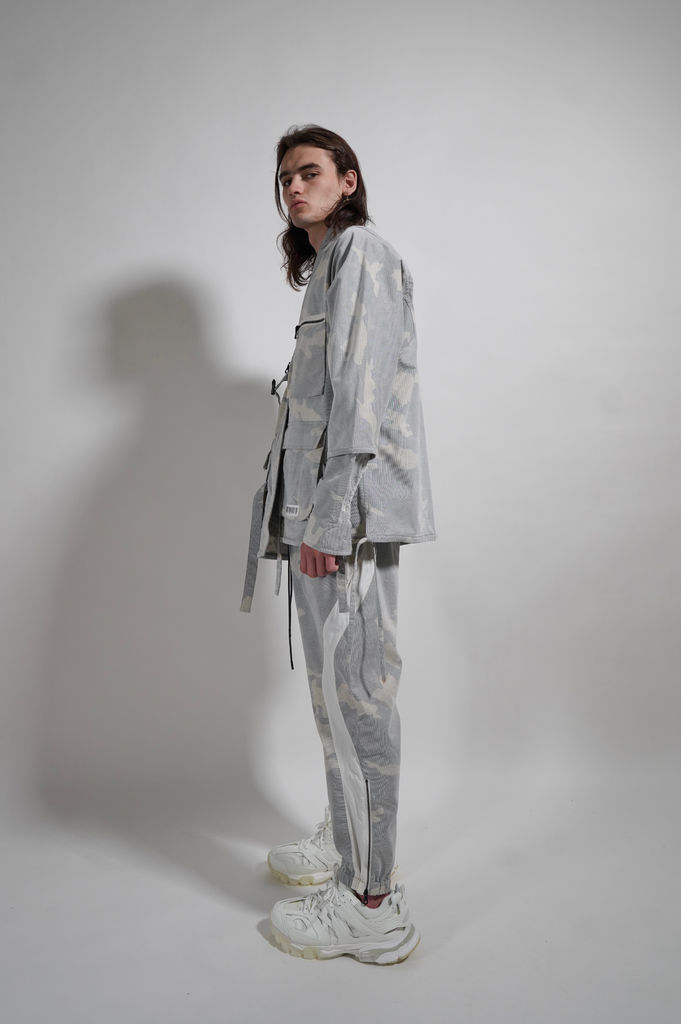 "WHITE CAMO" KIMONO-Traditional kimono silhouette in extremly unique white corduroy camo, four front cargo pockets, metal buckle fastening and side tie fastenings
