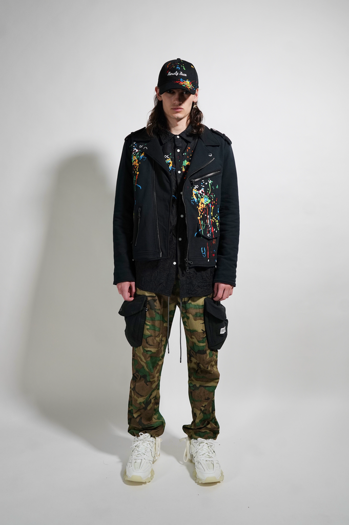 "FRENCH TERRY MOTO" JACKET- Standard moto jacket made in vintage black french terry with embroidered paint detailing