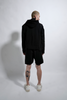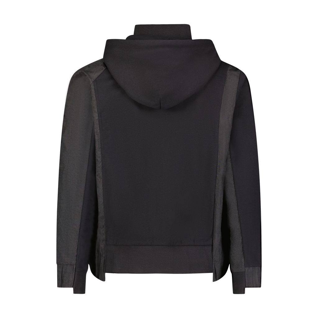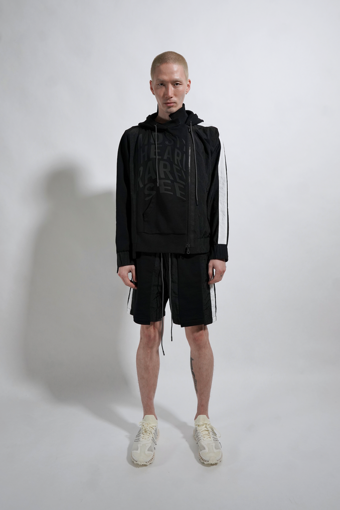 Black cotton french terry/nylon spliced seam oversized drop shoulder pullover hoodie with assymetrical zipper closure, large branded HD print and staggered hem detailing