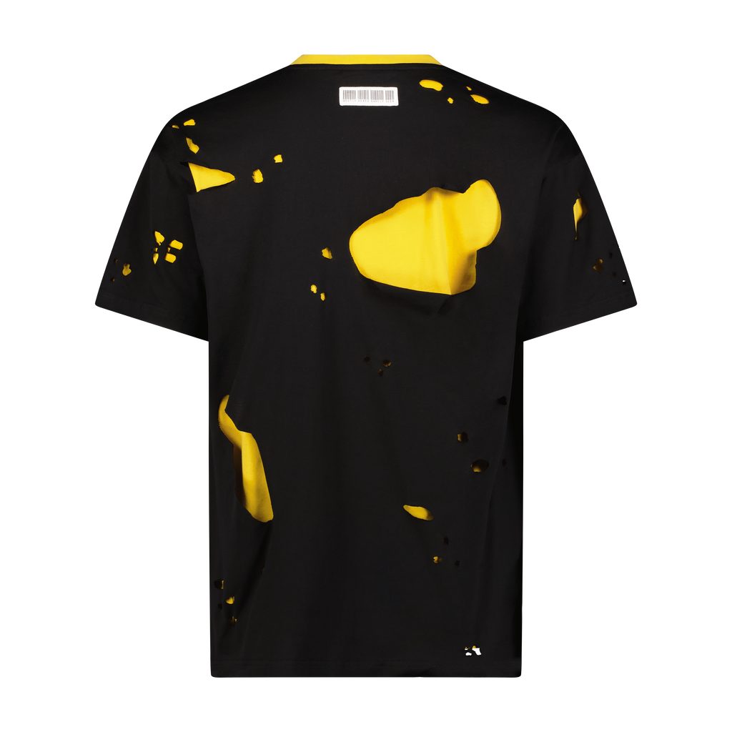Cotton box tee ripped up and backed with contrasted light weight cotton jersey fabric and hidden branded emboridery detailing across the front chest