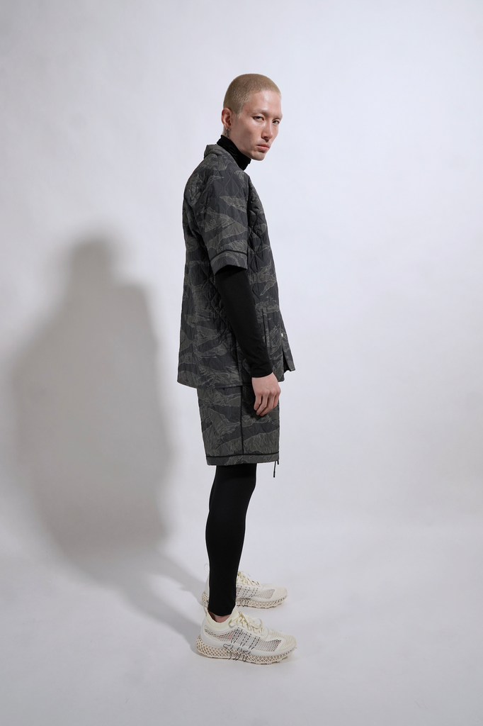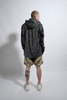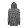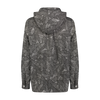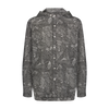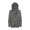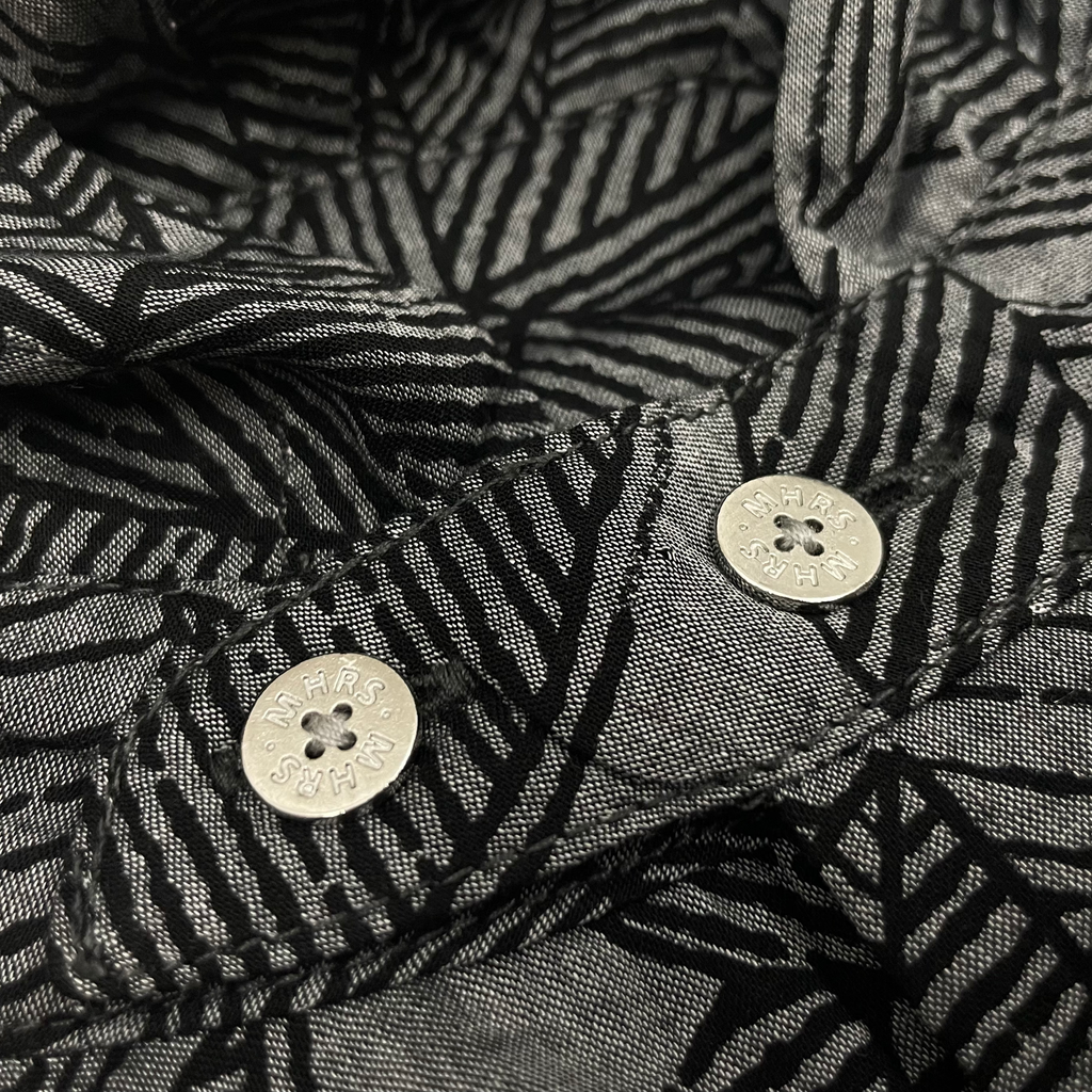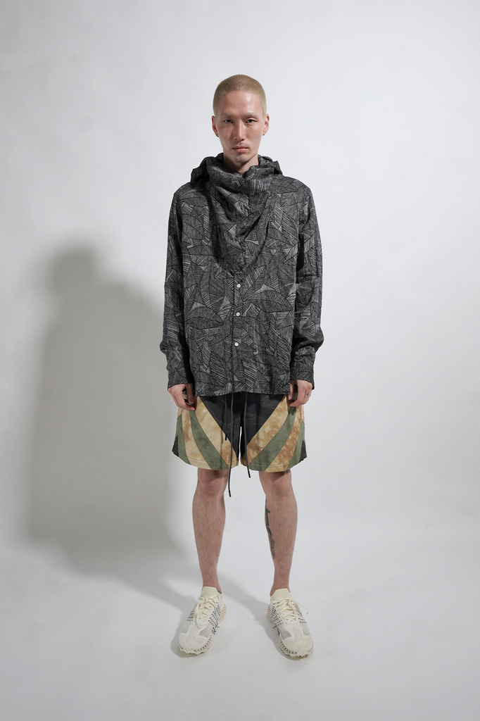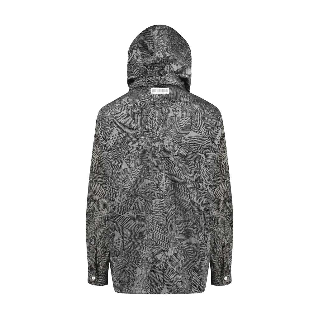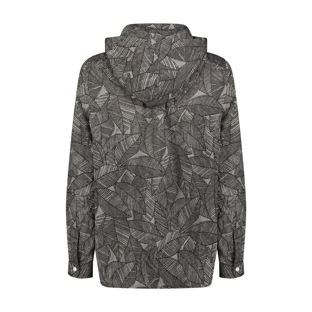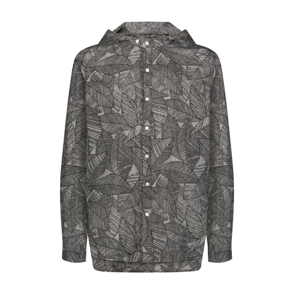 Unique black leaves printed, drop shoulder woven shirt with a double collar hood/face covering adjustable detailing