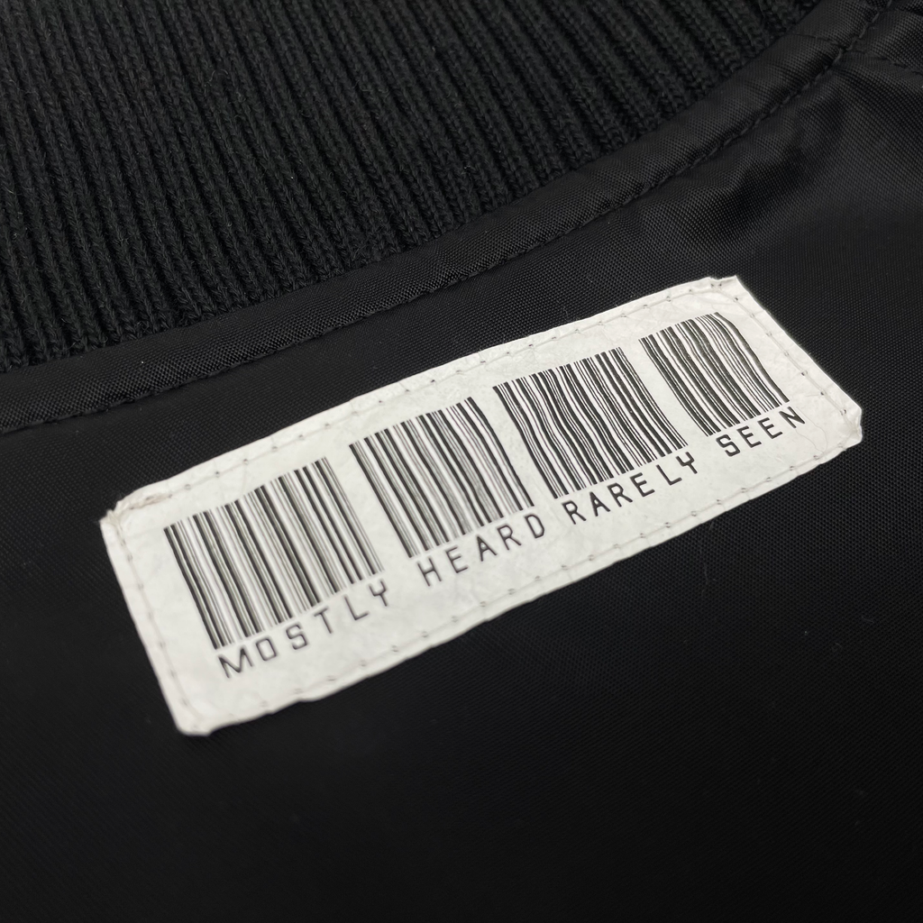 * MHRS signature tyvek barcode on center back neck