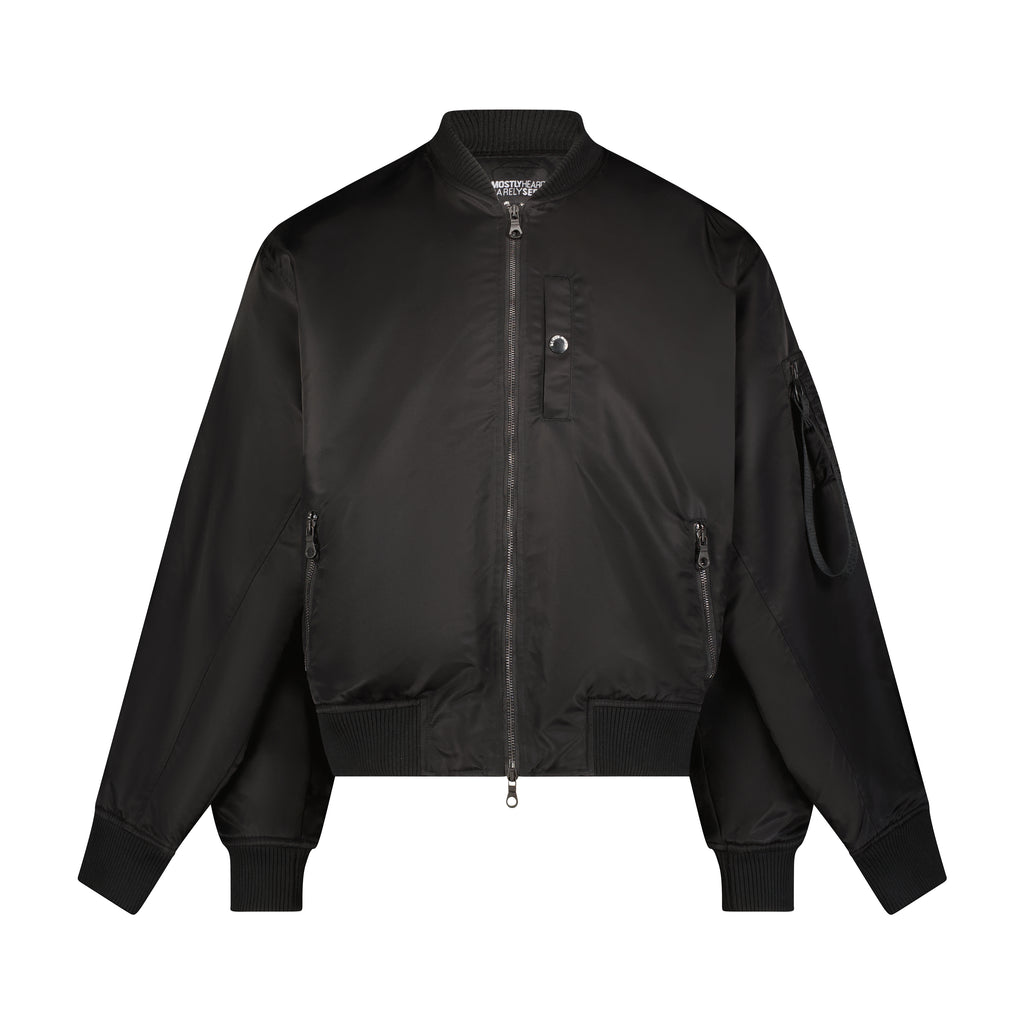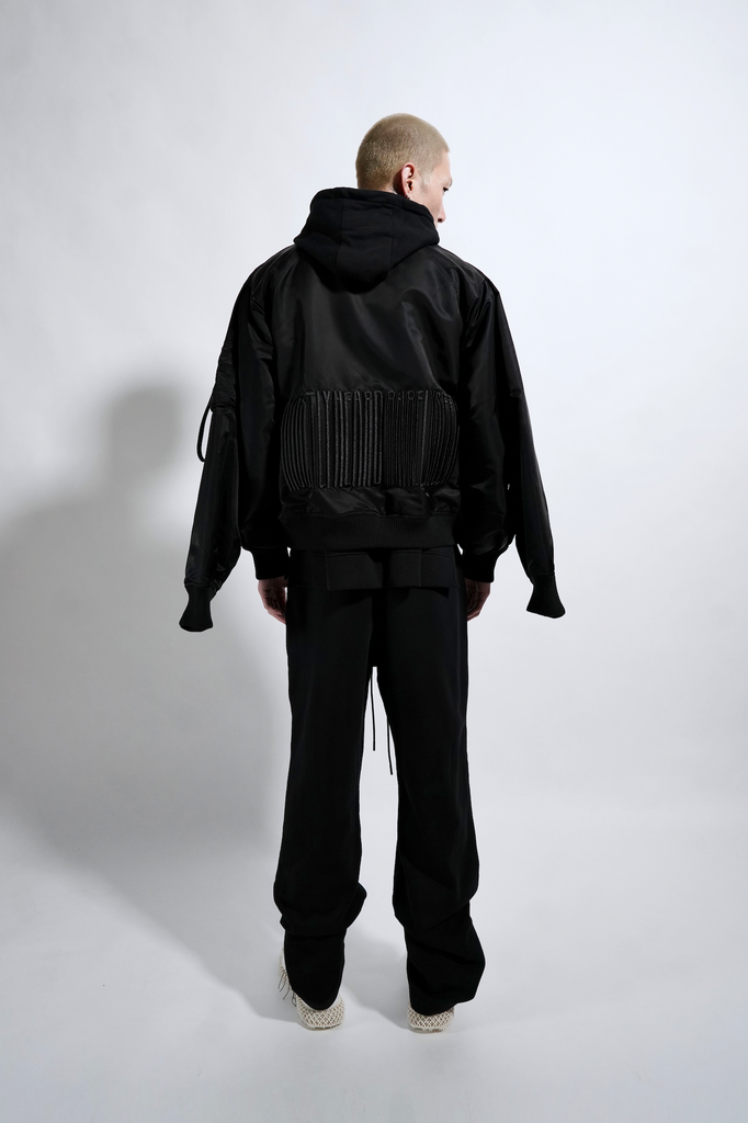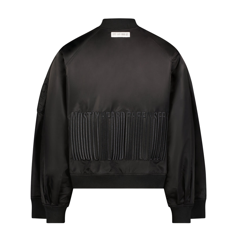 Black MA-1 oversized bomber with with double arm sleeve detailing, pleated sleeve details and branded 3D tonal embroidery on the lower back