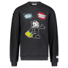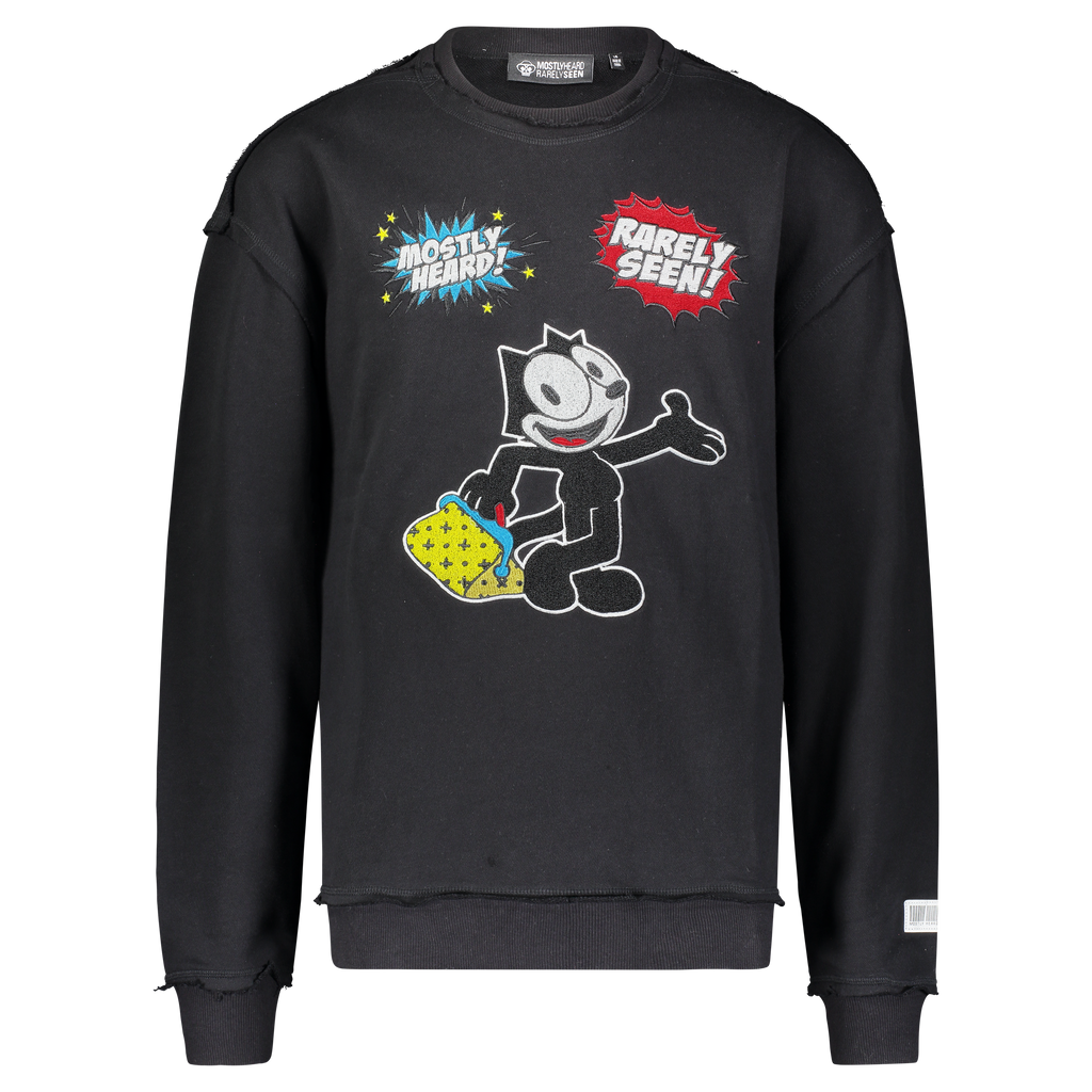 Cotton "Felix the Cat" mini chenille embroidery on front chest, over-sized raw-edge finished pull-over crew neck
